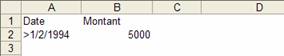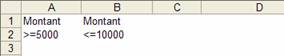 - qui répondent à plus d'un critère (ET logique), il faut indiquer plusieurs fois l'étiquette de cette colonne. Ainsi pour trouver les montants entre 5 000 et 10 000 on indiquera :