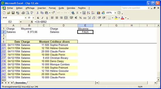 Ces critères permettent d'entrer dans la zone de critères une formule au lieu d'une valeur. Le titre (nom) du critère doit être différent d'un nom de colonne de la liste. Si ce critère fait référence à une cellule autre qu'une cellule de la liste, la référence doit être absolue.Exemples :