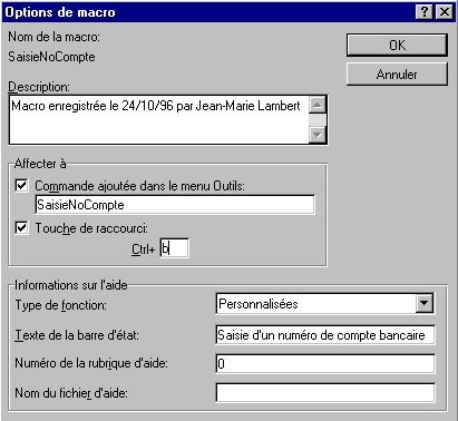 ' ' Contrôle du numéro de compte bancaire ' Function CtrlNoCompte(Compte) i = Int(Compte / 100) ' 10 premiers chiffres digit = Compte - i * 100 ' 2 derniers chiffres reste = i - Int(i / 97) * 97 ' reste de la division par 97 If reste = 0 Then reste = 97 If reste <> digit Then CtrlNoCompte = "Compte incorrect" Else CtrlNoCompte = "Ok" End If End FunctionA titre d'exemple, voici une macro commande (SaisieNoCompte) qui permet de saisir un numéro de compte bancaire, avec contrôle de validité.