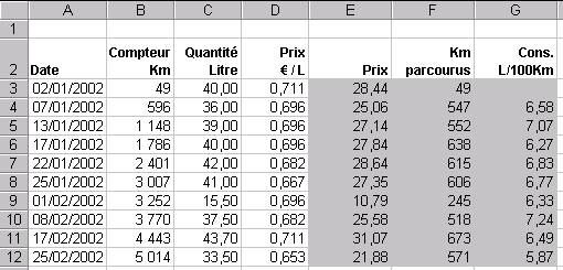 les kilomètres parcourus depuis le dernier plein (colonne F) et la consommation moyenne aux 100 Km (colonne G) : indiquer les formules