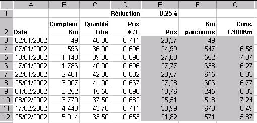 - Re-calculer la colonne E (le prix d'un plein de carburant) si on suppose (Oh miracle !) qu'on a obtenu une réduction de prix