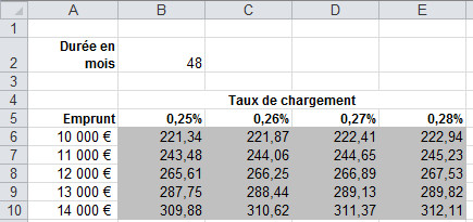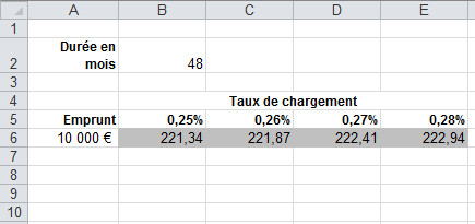 est indiquée en B2, le montant emprunté en A6 et les taux de chargement sont indiqués de B5 jusqu'à E5. La formule de la mensualité