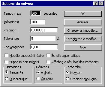 - Temps max : Limite la durée du processus de résolution. Bien que vous puissiez introduire toute valeur inférieure ou égale à 32 767, la valeur par défaut, 100 (secondes), convient à la plupart des problèmes mineurs.