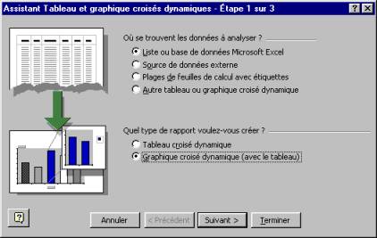 Pour créer un graphique croisé dynamique, on procède de la même manière que lors de la création du tableau croisé dynamique. Lors de la première étape (Figure 22), choisir "Liste ou base de données EXCEL" et "Graphique croisé dynamique (avec le tableau)".