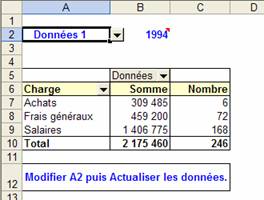 Enfin, il ne faut pas oublier d'actualiser le TCD (Sélectionner A5, puis Actualiser les données / Données) lorsqu'on modifie le contenu de la cellule A2.