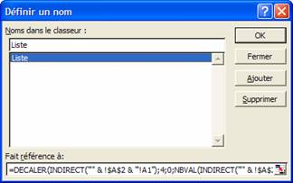 (Pour créer la liste des noms de feuilles, on se sert de la validation des données : Limiter la saisie aux données d'une liste).On utilise la fonction DECALER pour créer le nom "Liste" (Définir… / Nom / Insertion) qui fait référence à la liste définie à partir de la cellule A2 :