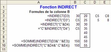 Par exemple, si la cellule D3 contient la valeur "C5",=INDIRECT(D3)renvoie "30" (la valeur dans C3). Remarquons que si on indique : =INDIRECT("D3") (au lieu de =INDIRECT(D3)), on reçoit "C5", plutôt que la valeur de C5.