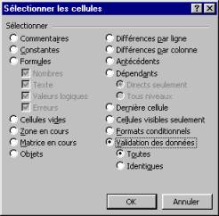 Pour trouver toutes les cellules de la feuille de calcul affectées de restrictions de don-nées ou de messages, cliquer sur TOUTES ou pour ne trouver que les cellules affectées des mêmes restrictions de données que la cellule sélectionnée, cliquer sur IDENTIQUES. Les cellules qui contiennent des critères de validation sont ainsi sélectionnées.