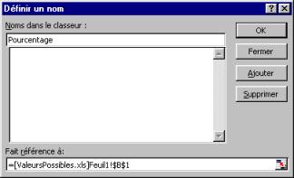 - définir un nom (DEFINIR…/NOM/INSERTION), par exemple Pourcentage, qui fait référence à cette cellule B1 de la première feuille de calcul d'un classeur nommé ValeursPossibles.xls.